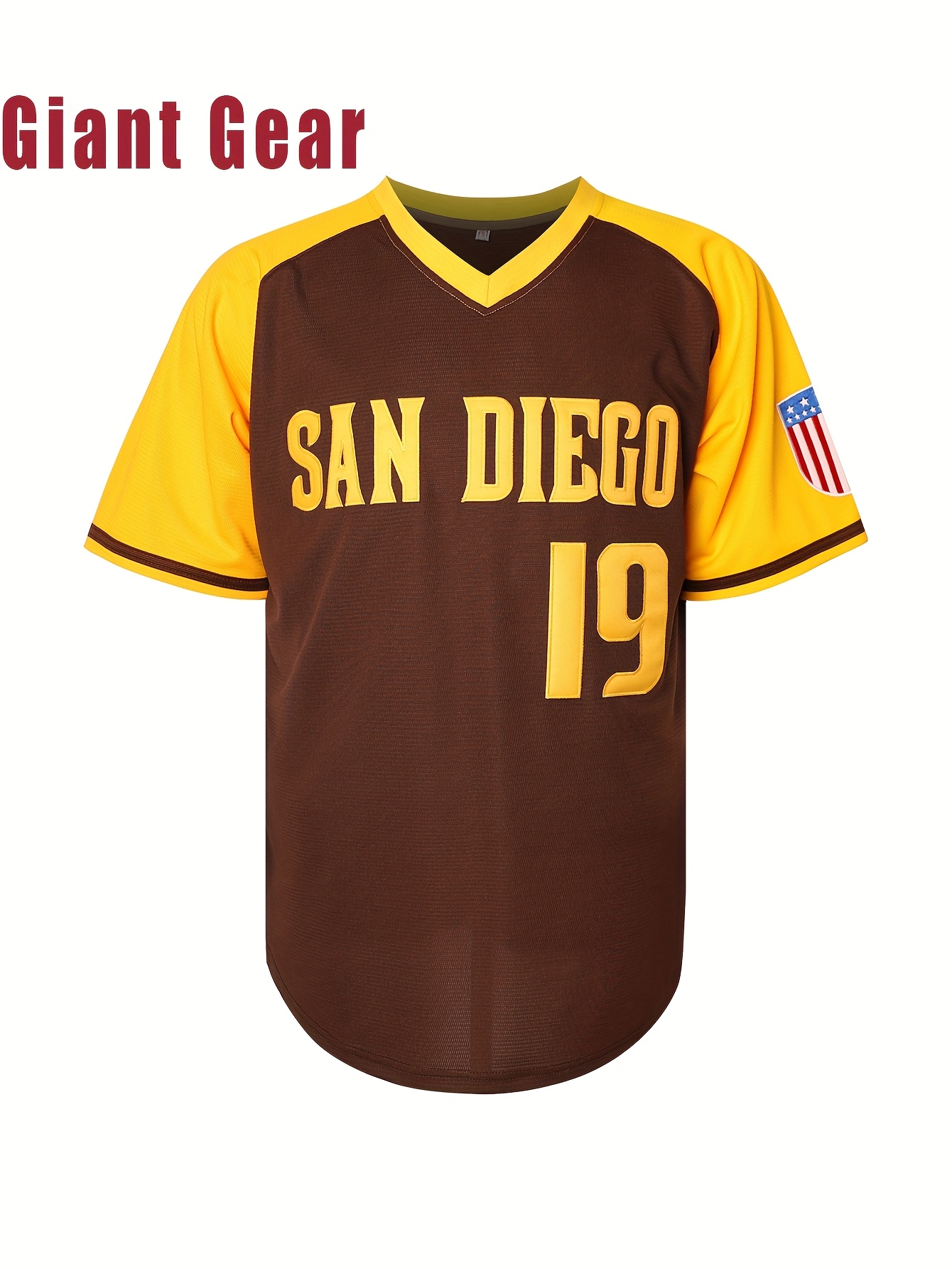 Men's #19 Brown Baseball Jersey with San Francisco Lettering & American Flag Patch - Loose Fit V-Neck Pullover for Training, Team Sports, Casual Wear (Sizes S-3XL), Outdoor Activity Clothing | Sporty Vneck Style | Durable Sportswear