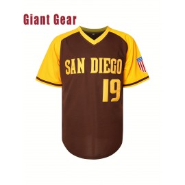 Men's #19 Brown Baseball Jersey with San Francisco Lettering & American Flag Patch - Loose Fit V-Neck Pullover for Training, Team Sports, Casual Wear (Sizes S-3XL), Outdoor Activity Clothing | Sporty Vneck Style | Durable Sportswear