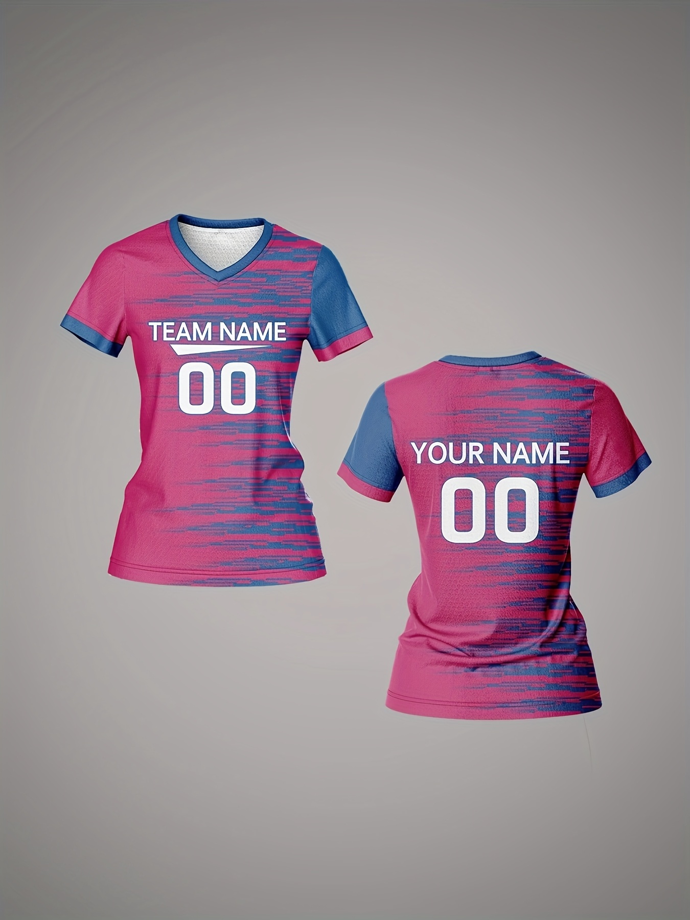 [Quick-Dry Soccer Jersey] Breathable Quick-Dry Custom Women's V-Neck Soccer Jersey | Personalized Name & Number, Pink with Blue Stripes for Team Training, Sports Fitness, and Casual Wear