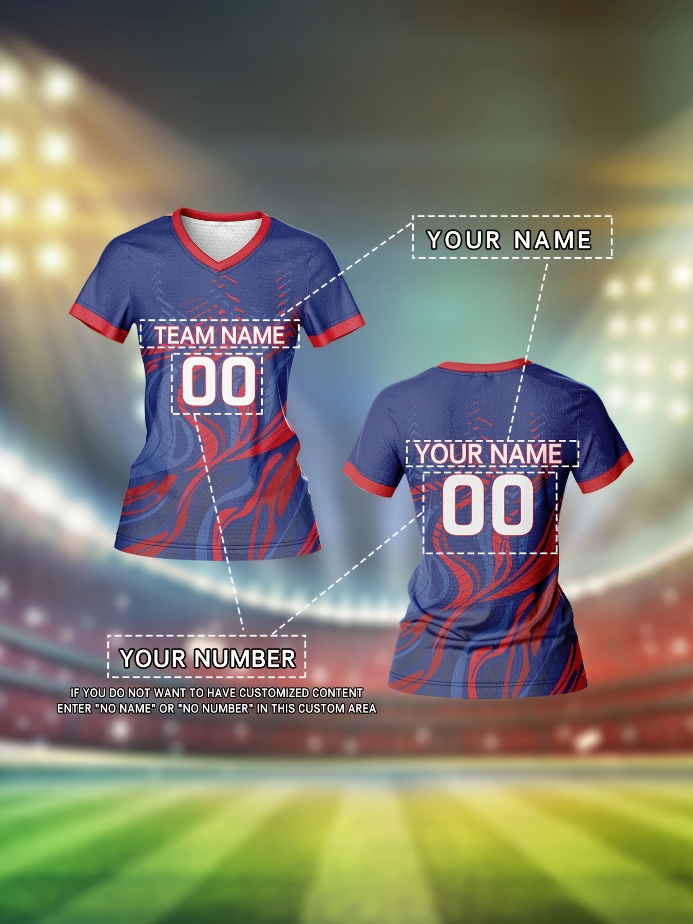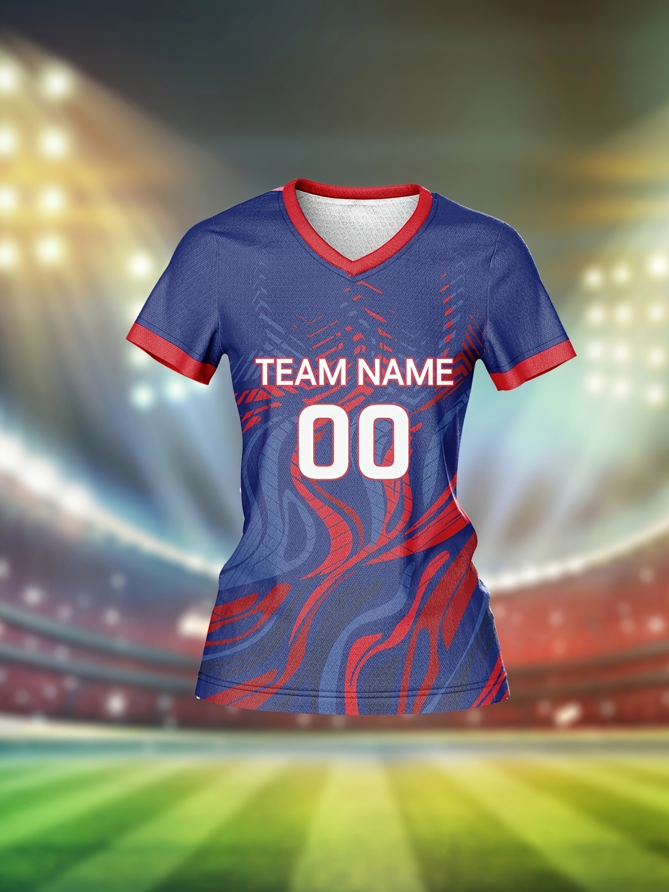Customizable Women's V-Neck Football Jersey - Personalized Name & Number, Breathable Polyester, Quick-Dry Sports Top for Team Training, Casual Wear, and Fitness - Blue with Red & White Accents, Sports Training Top | Athletic Clothing | Smooth Fabric