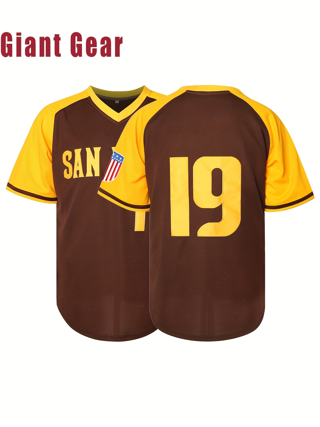 Men's #19 Brown Baseball Jersey with San Francisco Lettering & American Flag Patch - Loose Fit V-Neck Pullover for Training, Team Sports, Casual Wear (Sizes S-3XL), Outdoor Activity Clothing | Sporty Vneck Style | Durable Sportswear